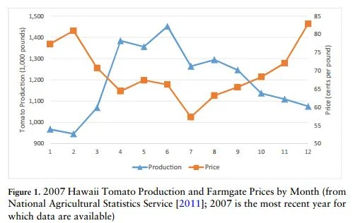 This new paper in the Journal of Agriculture and Applied Economics by some Hawaiian researchers provides some empirical evidence of the price volatility I mention surrounding local foods. Here's a graph from their paper showing production and prices of local tomatoes over 12 months of the year