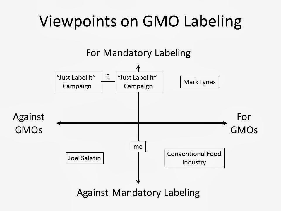 I strongly suspect there is another dimension here that partially explains the liberal tendency to want to regulate GMOs: the tendency to see corporations and capitalism as corrupting forces - i.e., aversion to agribusiness in the food sector. Thus, even if many liberals support GMOs in theory (being "for GMOs" on Parke's graph), they may not in practice (being "for mandatory labeling" on Parke's graph).