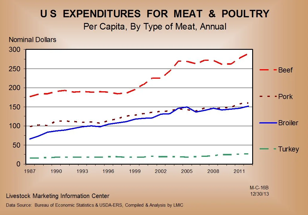 One final point. Yes, per capita consumption of chicken is on on the rise and has been higher than beef for now over 20 years (according to USDA data). But, that is largely because chicken has become much less expensive and, lately, beef more expensive.
