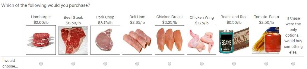 In FooDS, each person is told "Imagine you are at the grocery store buying the ingredients to prepare a meal for you or your household. For each of the following nine questions that follow, please indicate which meal you would be most likely to buy." Then, they are presented with nine questions that look like the one below. The only differences across the questions are the prices assigned to each item and the order of the items.