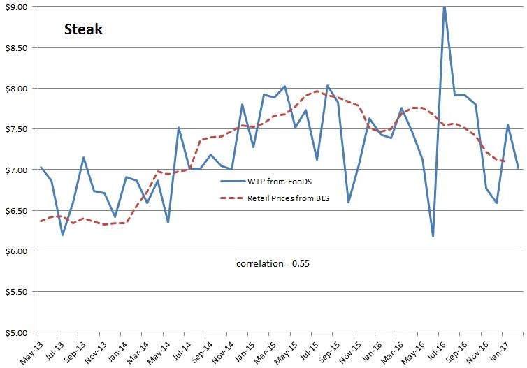 The above graphs reveals three things. First, WTP is not the same thing as a price. WTP is (at least in theory) a "pure" measure of demand, but prices can be affected by demand and by supply-side factors. Second, despite the above statement, it appears there is some relationship between the two measures as the correlations between WTP and prices are 0.44 for ground beef and 0.55 for steak. Third, WTP as measured by FooDS is much more volatile from month-to-month than are prices.
